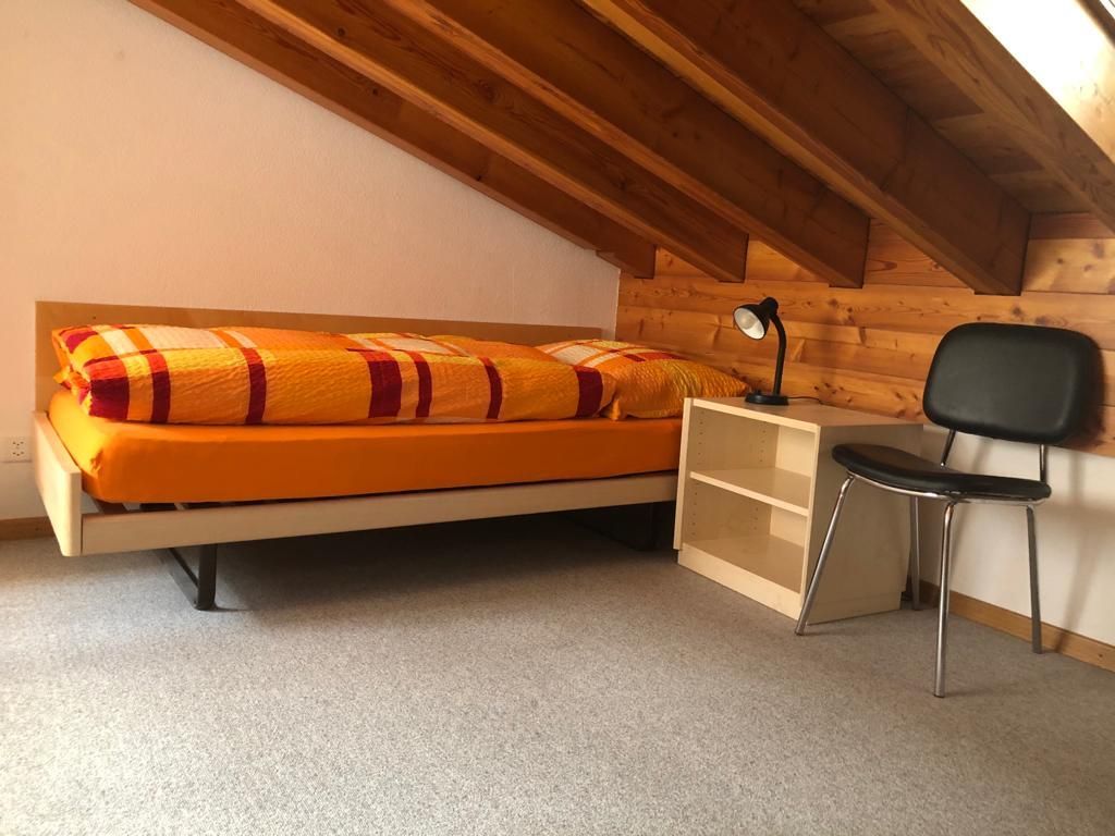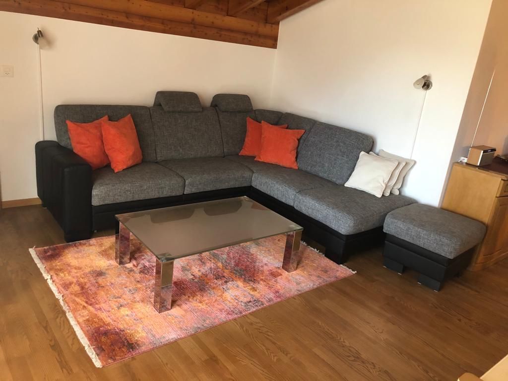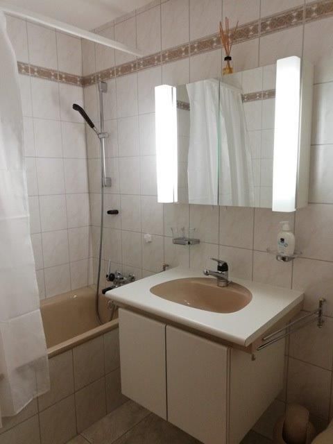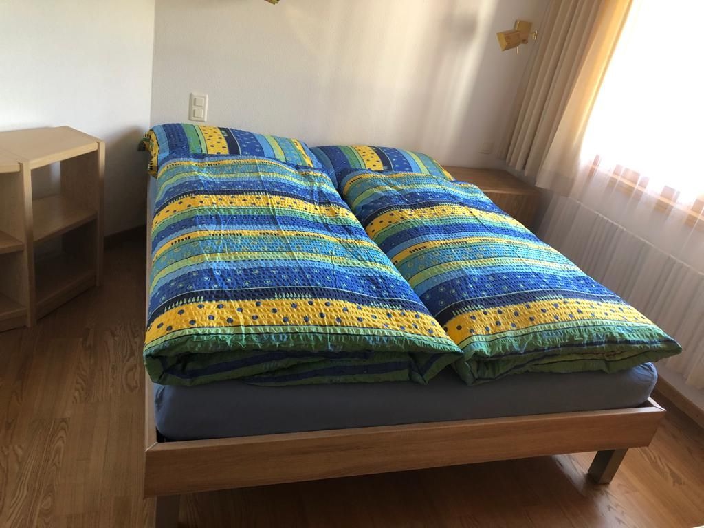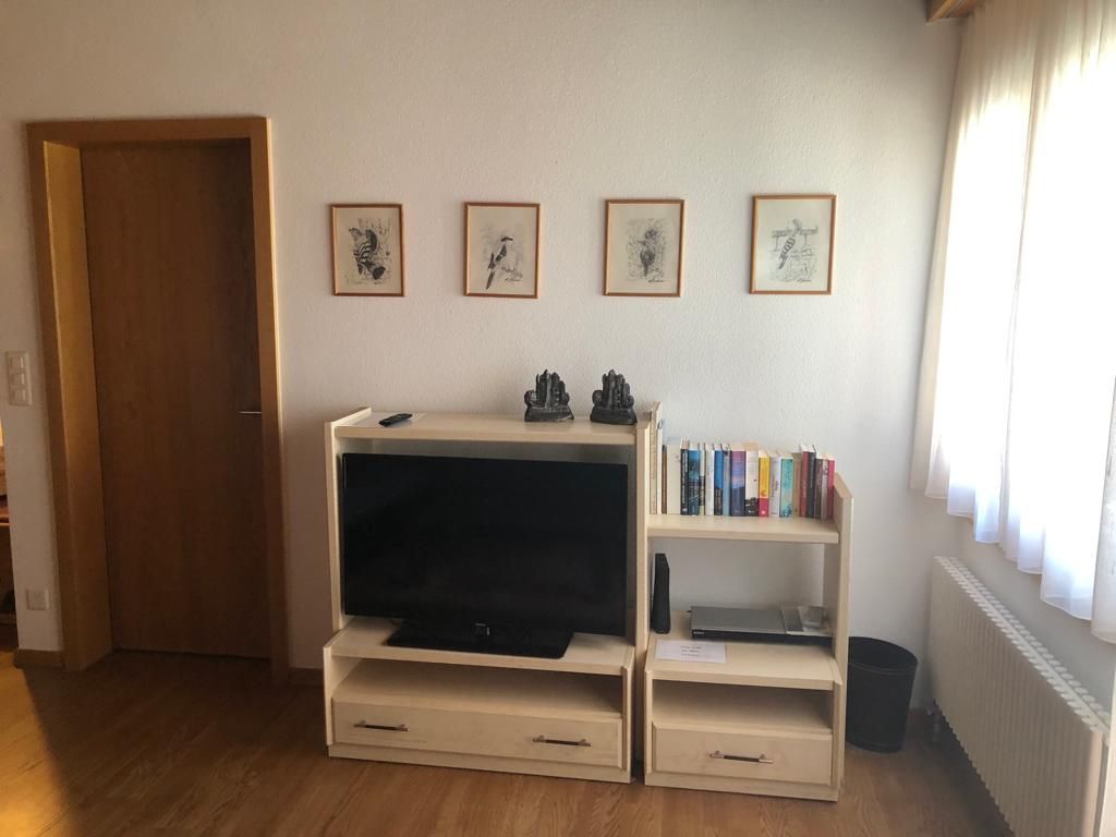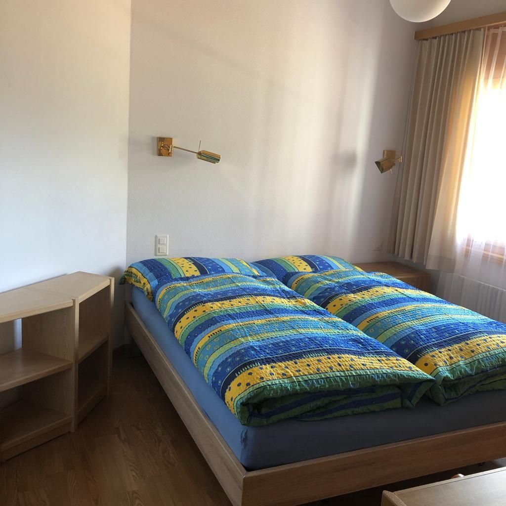 Wohn-/Ess-/Schlafzimmer mit 2 Einzelbetten, Flat-TV, gratis W-LAN, offene Küche, Bad/WC, Nord-West-Balkon mit Panorama-Aussicht auf die Berge. Waschmaschine und Tumbler im Haus. Tiefgaragenplatz inklusive. Haustiere sind nicht erlaubt. Nichtraucher-Wohnung.