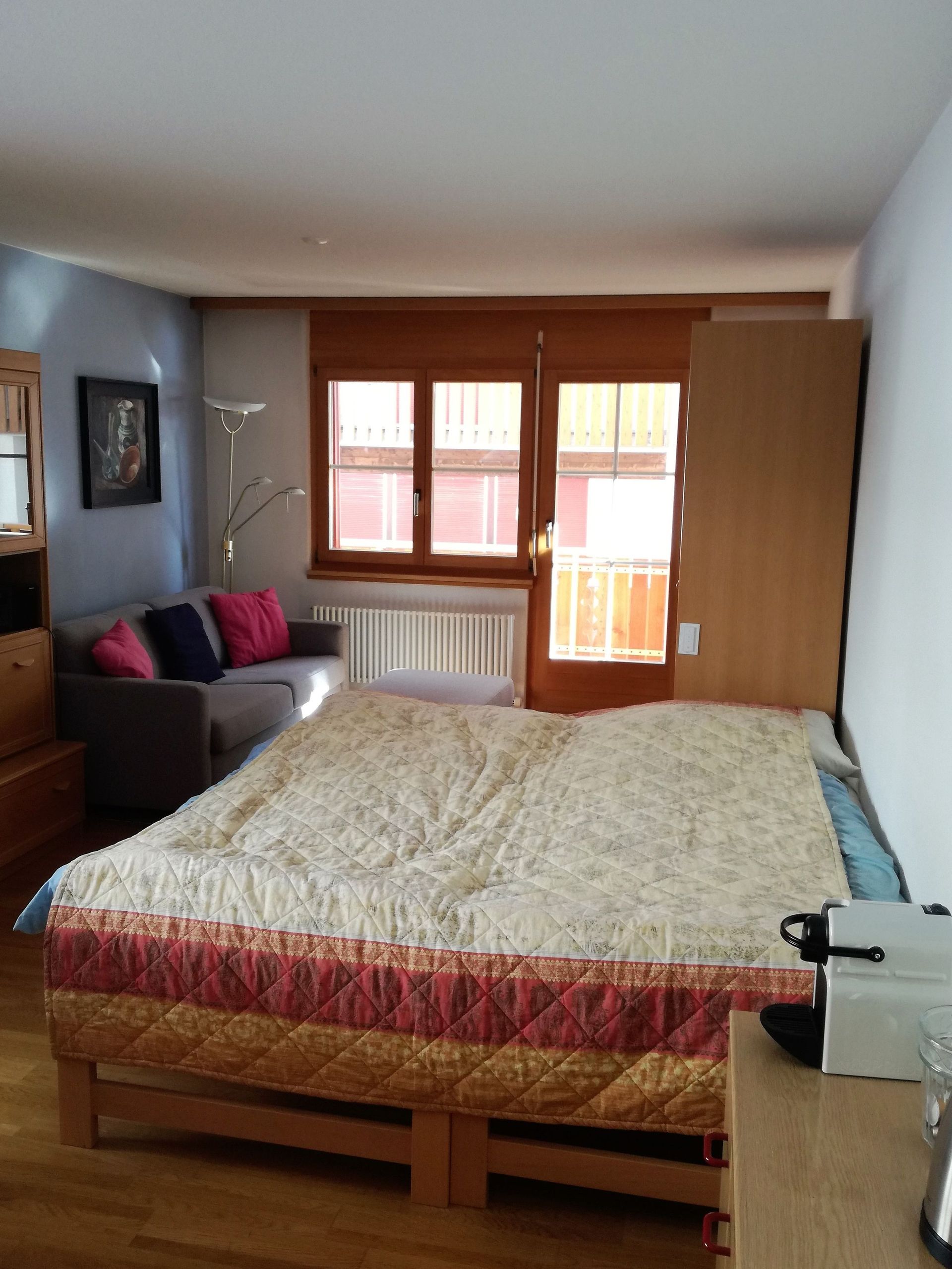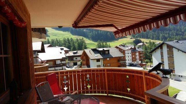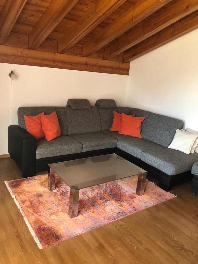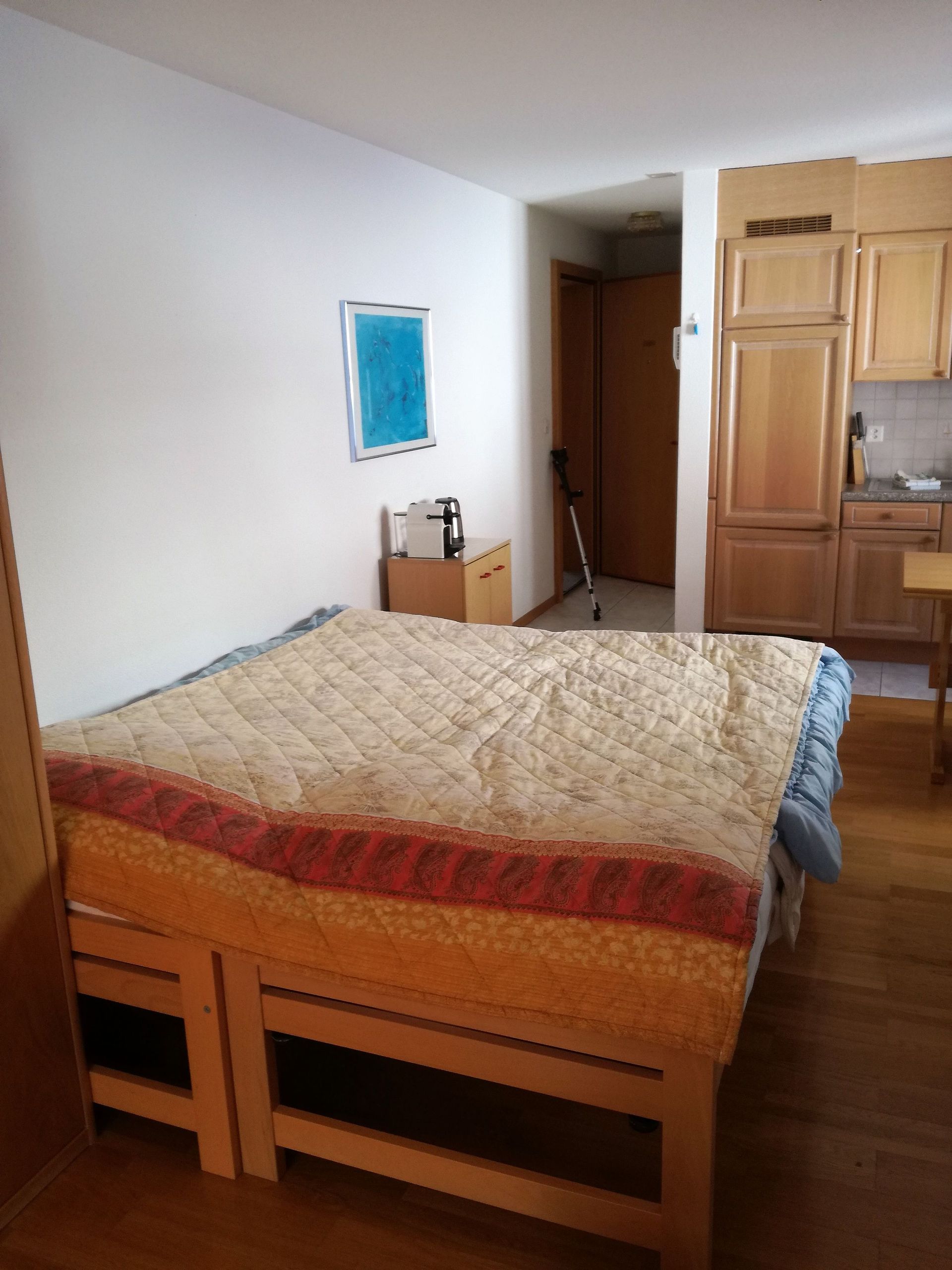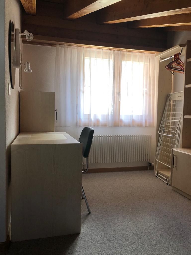 Wohn-/Ess-/Schlafzimmer mit 2 Einzelbetten, Flat-TV, gratis W-LAN, offene Küche, Bad/WC, Nord-West-Balkon mit Panorama-Aussicht auf die Berge. Waschmaschine und Tumbler im Haus. Tiefgaragenplatz inklusive. Haustiere sind nicht erlaubt. Nichtraucher-Wohnung.