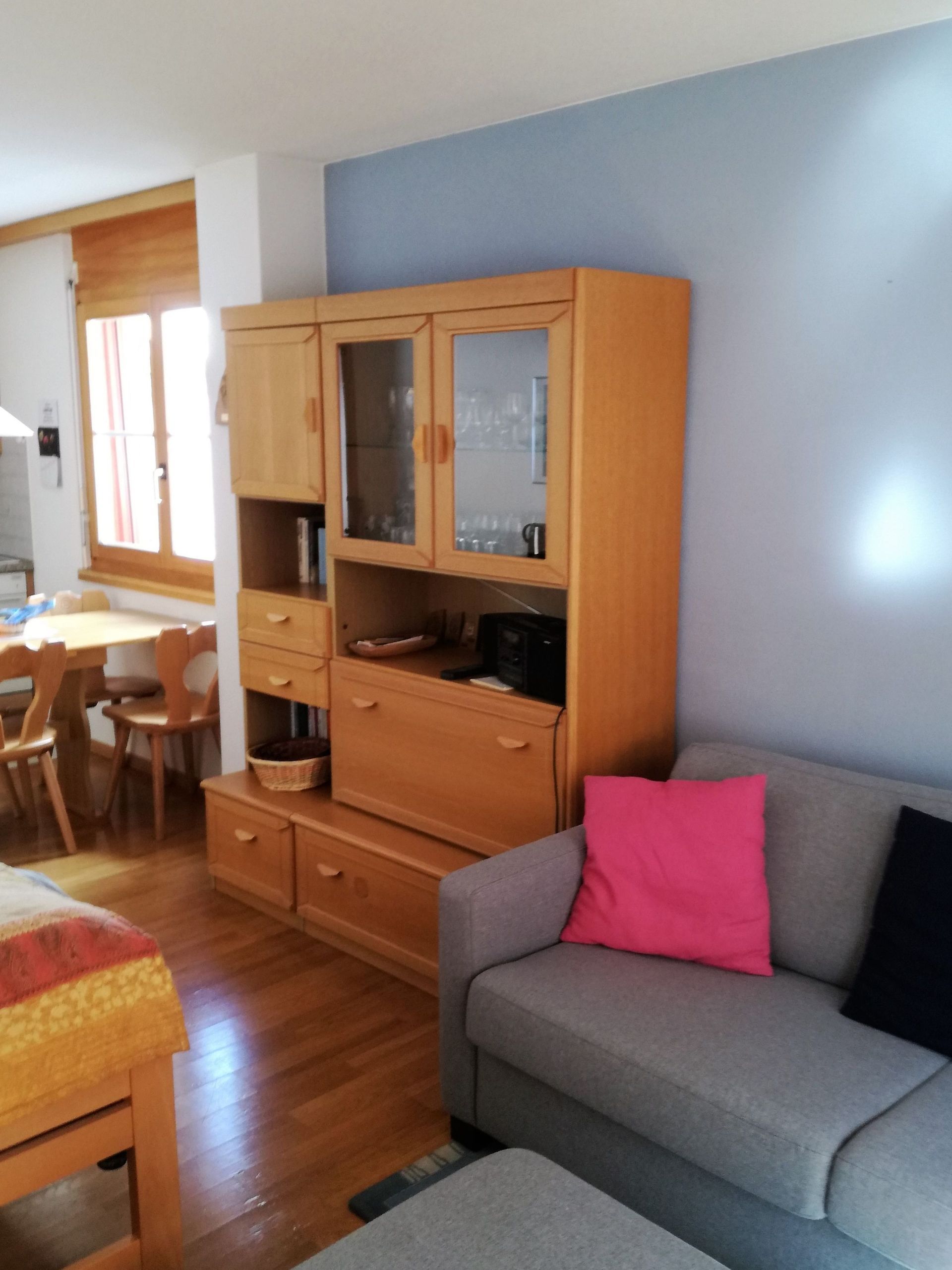 Wohn-/Esszimmer, Küche mit Geschirrspüler, 1 Doppelschlafzimmer, Bad/WC, Südterrasse, gratis WiFi, Telefon, Radio, TV vorhanden. Waschmaschine und Tumbler im Haus. Tiefgaragenplatz inbegriffen. Nichtraucherwohnung! Haustiere nicht erlaubt.
